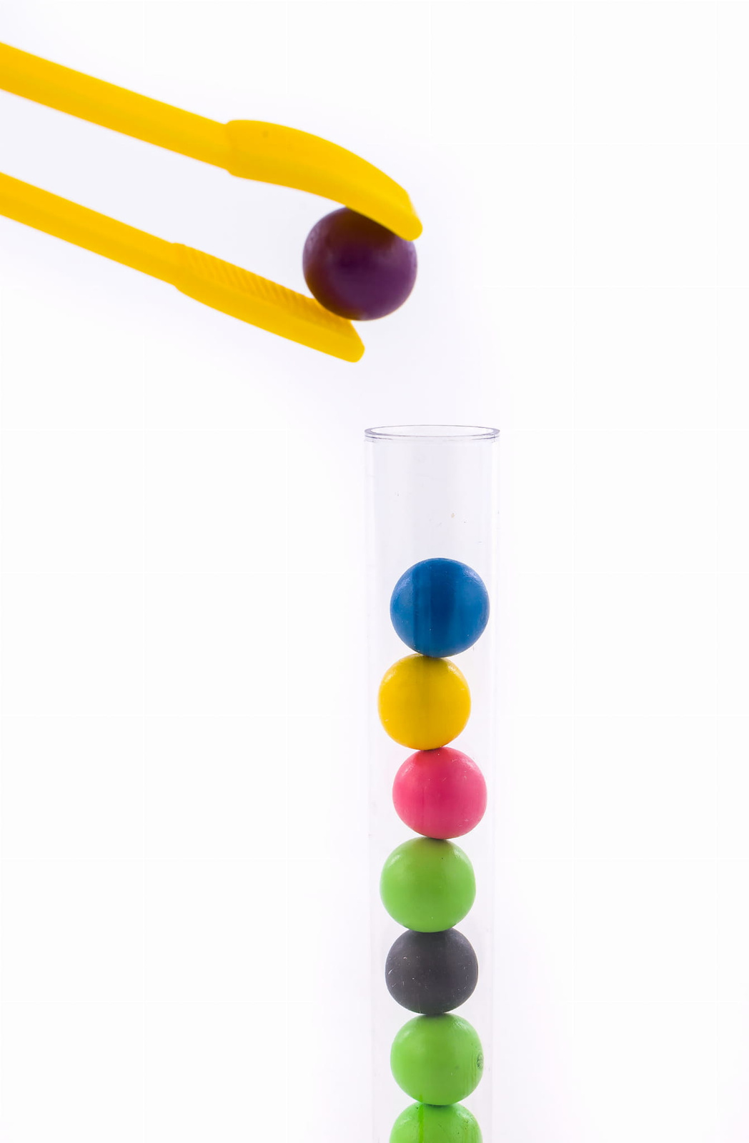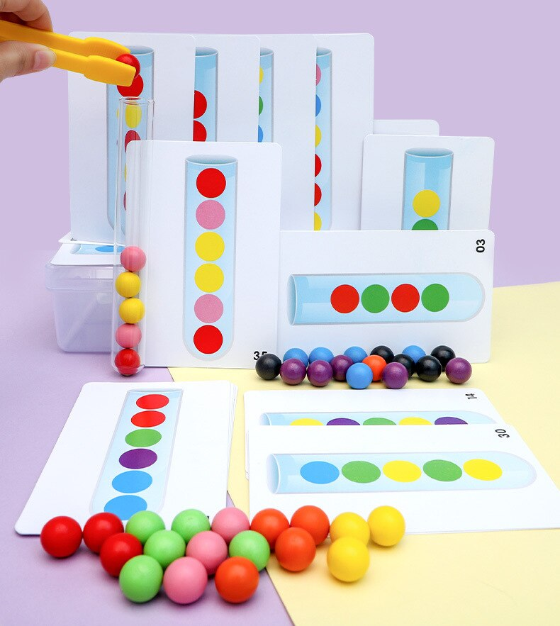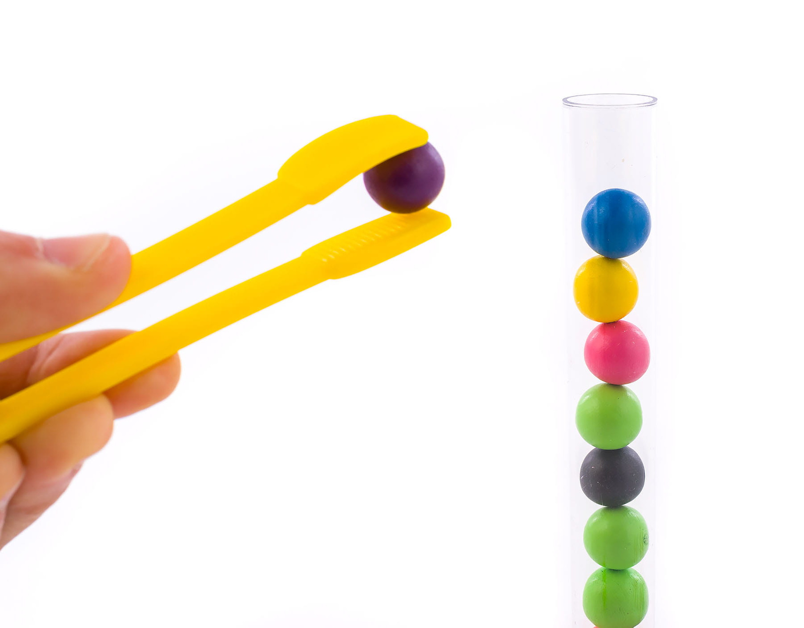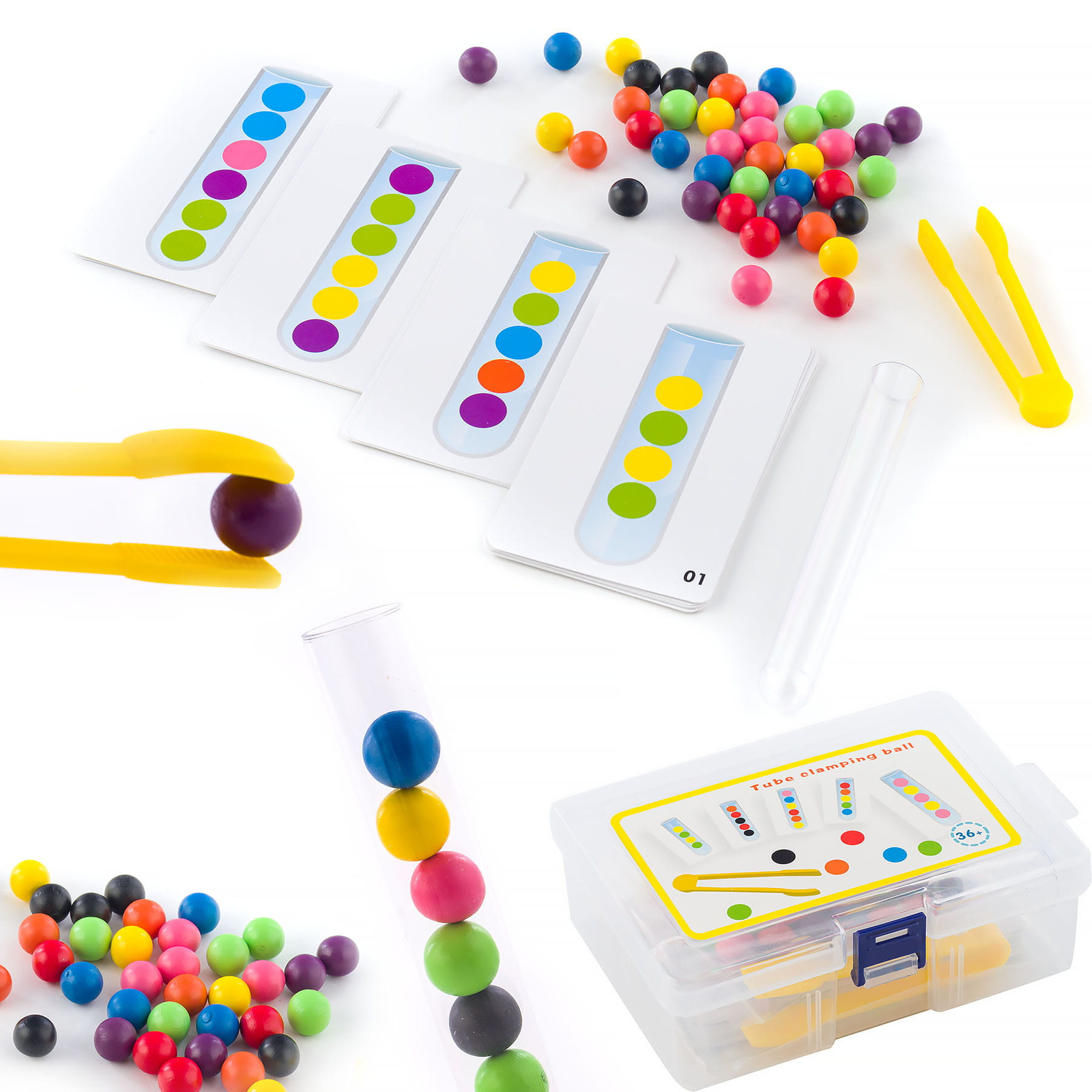 Zabavna i edukativna igračka u obliku epruvete s obojenim kuglicama potiče koncentraciju, logičko razmišljanje i pamćenje. Djeca uče prepoznavati boje, razvijaju motoriku i spretno koriste pincetu dok slažu kuglice prema zadanim karticama.