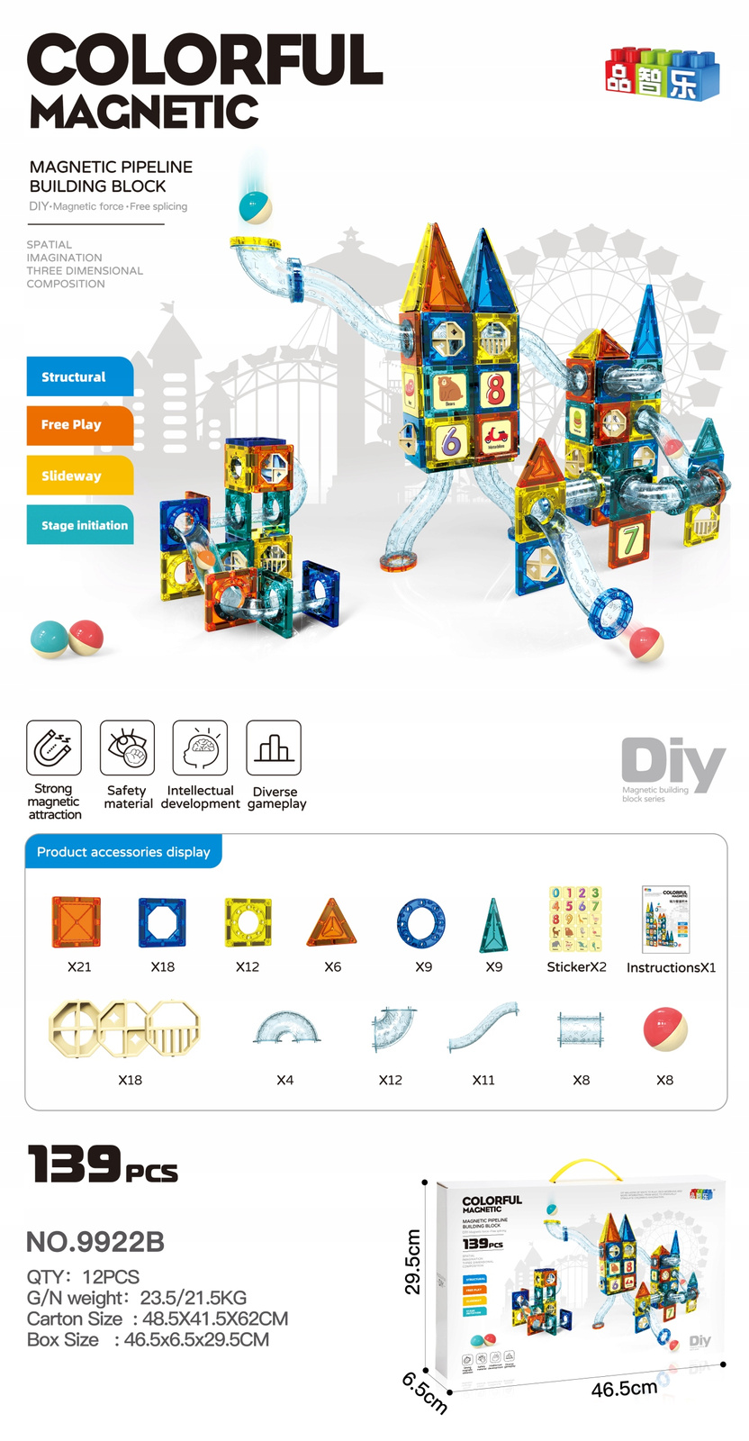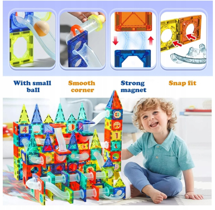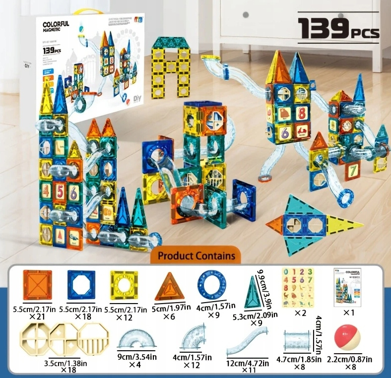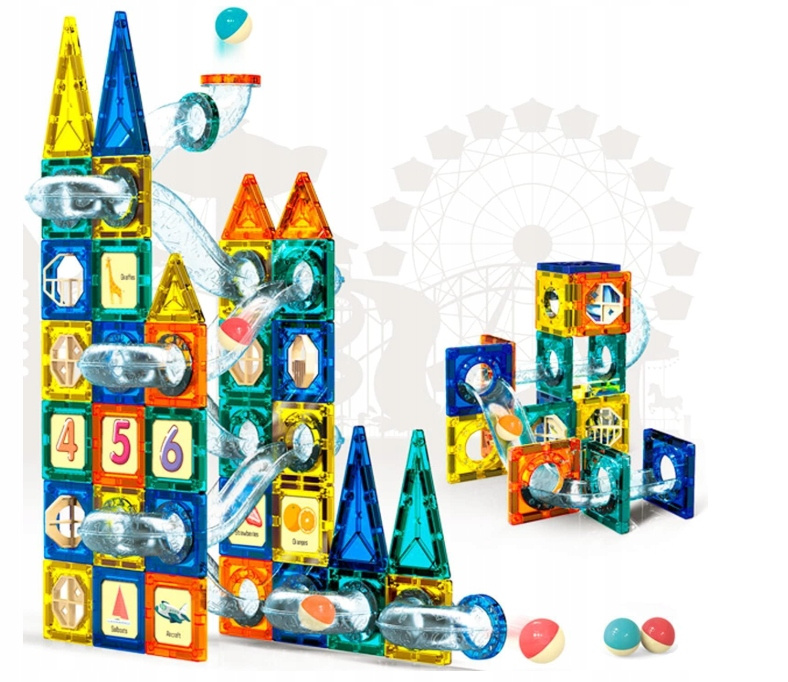 Edukativni set magnetnih kocaka STEAM sadrži 139 dijelova u 4 boje, prozirne dijelove za izgradnju tobogana s kuglicama, naljepnice s brojevima i prijevoznim sredstvima te 8 kuglica. Potaknite djetetovu kreativnost, logičko razmišljanje i zabavu kroz igru! Sigurna i edukativna igra za djecu 3+ godine