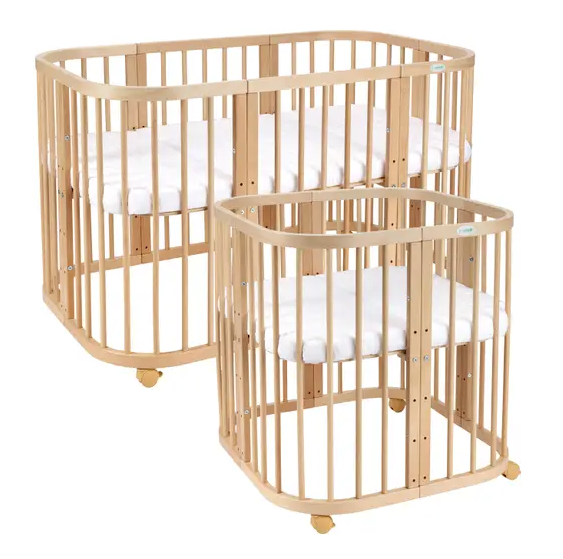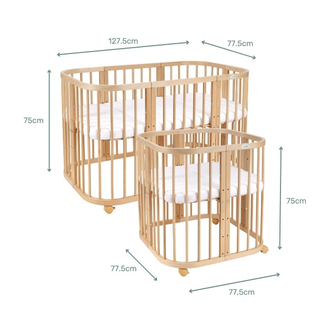 Ovaj dječji krevetić je 7 u 1, što znači da objedinjuje karakteristike pomoćnog ležaja, manjeg krevetića, većeg kreveta, ogradice, stola za prematanje, stola i dvije stolice.
